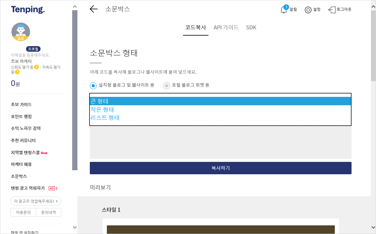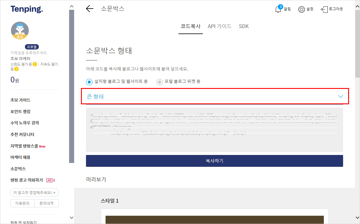 그럼 바로 소문박스 형태 선택과 스크립트를 복사할 수 있습니다.