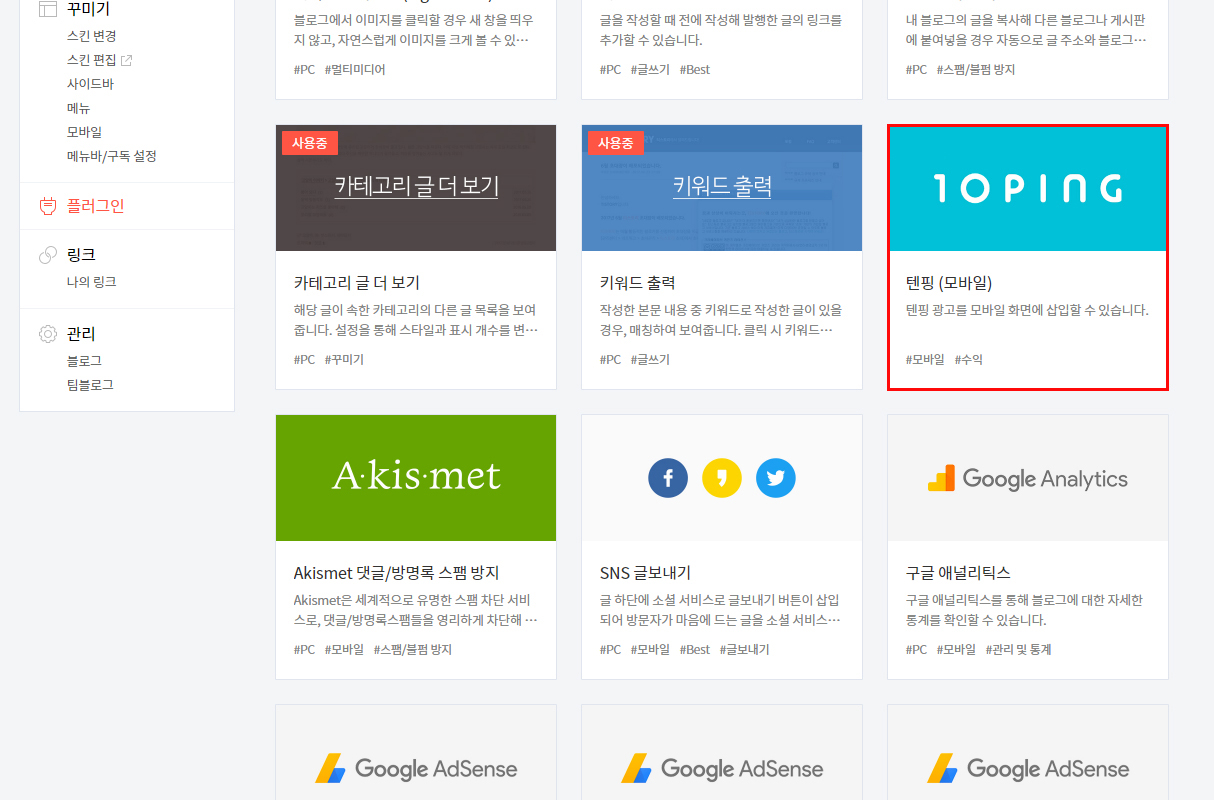 그리고 블로그 관리페이지에서 플러그인 > 텐핑(모바일)을 찾아주세요.